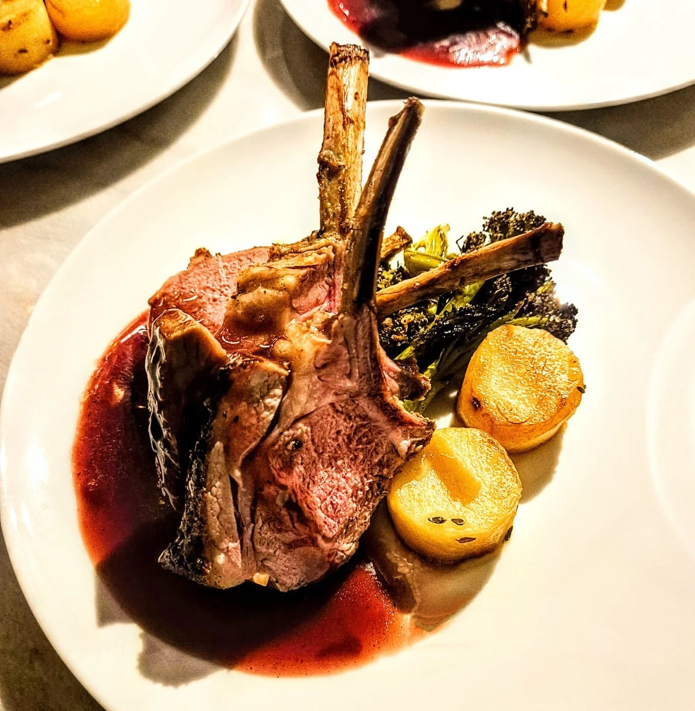 A delicious 3 course meal of scallops (cheese soufflé for our daughter), Lamb rack (Ribeye for the protein hungry daughter (and lab ;)) and then a lovely mango 7 passionfruit Eton mess to finish.
